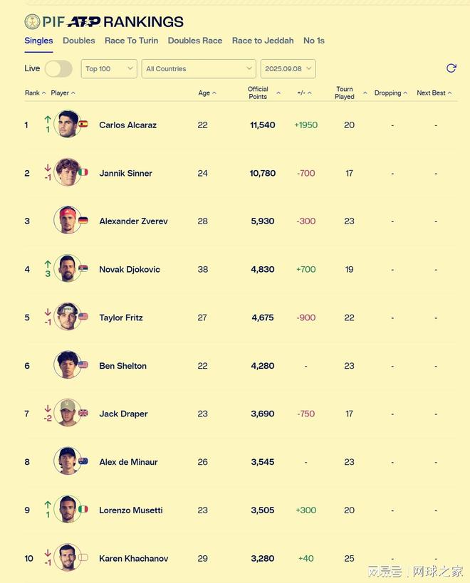 北京时间昨天下午,ATP/WTA相继更新了最新一期世界积分排名榜。男单方面:西班牙红星阿尔卡拉斯携美网冠军奖杯重返世界第一,辛纳和兹维列夫分别排在第二和第三位。打进四强的德约科维奇升至世界第四,其他TOP10的排名略有升降。