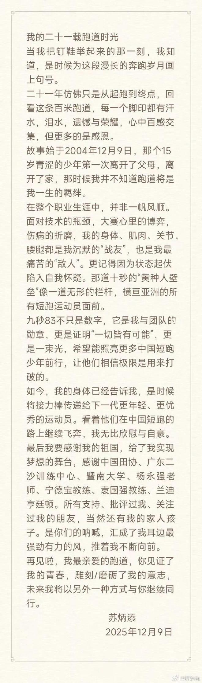 北京时间12月9日,男子100米亚洲纪录保持者、中国短跑名将苏炳添正式宣布退役。他在社交媒体中写道:“再见啦,我最亲爱的跑道,你见证了我的青春,雕刻/磨砺了我的意志,未来我将以另外一种方式与你继续同行。”