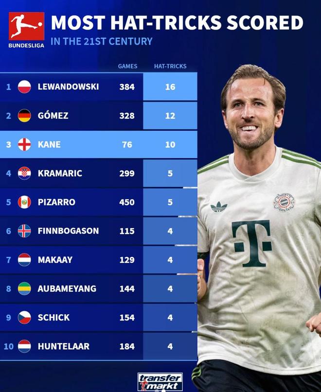 北京时间12月9日,德转统计出了本世纪德甲联赛戴帽次数最多的10名球员,莱万多夫斯基以16次戴帽高居第一,马里奥-戈麦斯12次戴帽排名第二,哈里-凯恩仅用76场比赛10次戴帽排名第三。