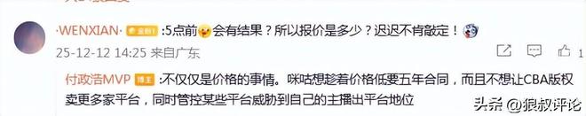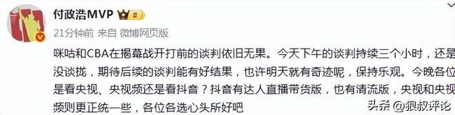 付政浩在评论区与球迷互动当中,提到了目前双方分歧的原因:不仅仅是价格的事情。咪咕想趁着价格低要五年合同,而且不想让CBA版权卖更多家平台,同时管控某些平台威胁到自己的主播出平台地位。此前,由于咪咕和CBA官方谈判尚未达成一致,咪咕官方公开致信球迷:CBA常规赛开赛在即 很遗憾暂未获得新赛季转播权。