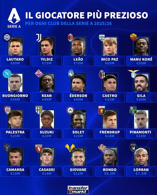 北京时间12月24日,在更新了意甲球员的身价之后,德转列出了意甲20家俱乐部各自身价最高的球员,国际米兰的劳塔罗以8500万欧元领衔,比萨全队身价最高的巴西19岁中场洛兰以750万欧元排名垫底。